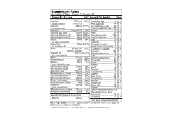Combines a multivitamin formula with a whole food base to provide the added support of nutrients not found in typical multivitamins.
