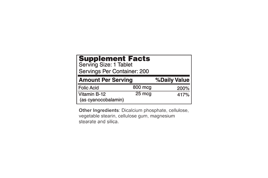 This formula provides 800 mcg of folic acid along with 25 mcg vitamin B-12 (as cyanocobalamin).