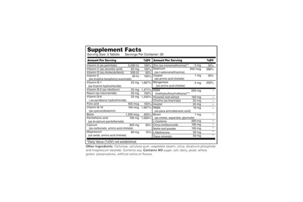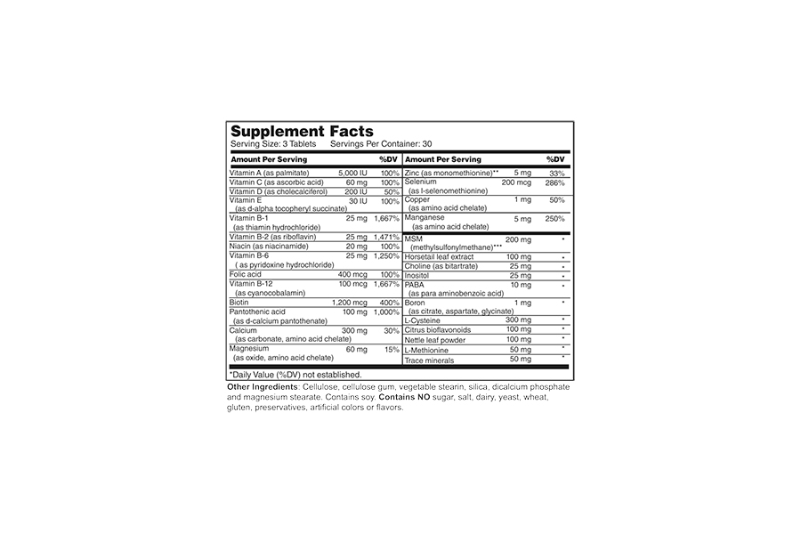 A complete formulation of vitamins, minerals and nutrients which have been shown to promote healthier hair, skin and nails from the inside out.