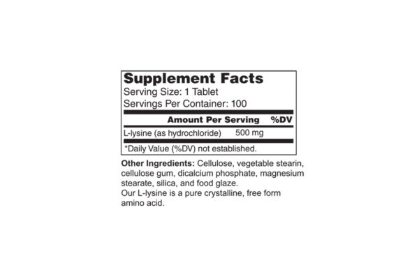 L-Lysine is an amino acid which provides nutritional support for the body’s natural defenses. L-Lysine is particularly helpful in maintaining healthy gum, lip and skin tissue. Each tablet contains 500mg of the amino acid.