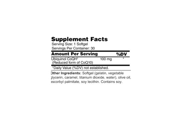 Ubiquinol is the active antioxidant form of CoQ10. It has an additional two hydrogen atoms and comprises the majority of the ubiquinone/ubiquinol pool in the plasma of healthy subjects. Ubiquinol may be important for older individuals or individuals who appear not to respond to regular CoQ10 supplementation due to poor conversion of CoQ10 in the body. This formula supplies 100 mg of CoQ10.