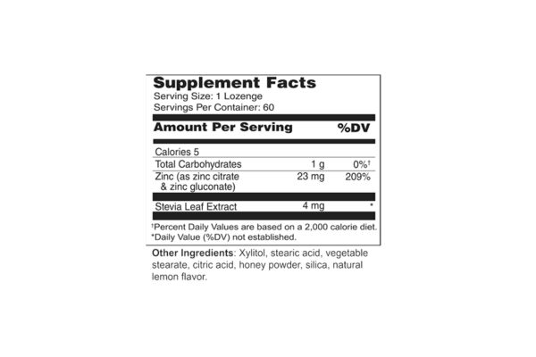Provide 23 mg of zinc from zinc citrate and zinc gluconate. Sweetened with stevia and flavored with natural lemon flavor.